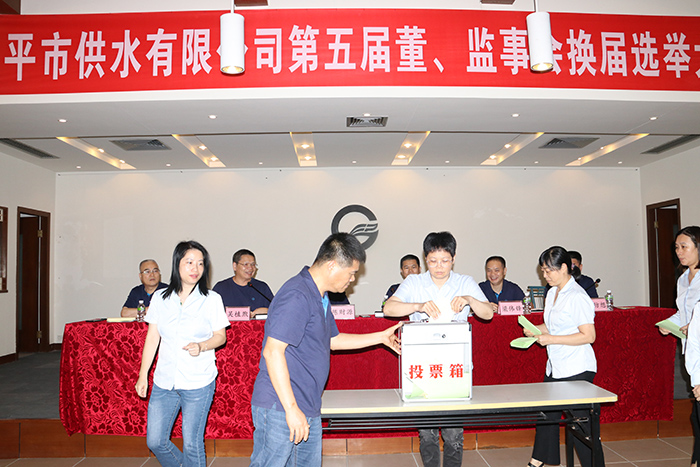 ???????5月12日下午,公司第五屆董事會、監(jiān)事會換屆選舉大會在公司六樓大會堂召開。會議由公司董事吳植煦主持,出席的股東84人,代表97.05%的股份。????會上,上一屆董事長何振光代表董事會回顧了任期內(nèi)的主要經(jīng)營做法,包括抓好供水主業(yè)和安裝業(yè)務(wù)的經(jīng)營管理、開展穩(wěn)健的資本資產(chǎn)運營、不斷推進(jìn)公司規(guī)范化管理、抓好公司黨建和企業(yè)文化建設(shè)、加強公司與政府/銀行/用戶/員工等四大關(guān)系的建設(shè),