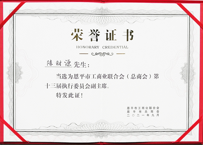 9月29日下午,市工商聯(lián)(總商會(huì))第十三次會(huì)員代表大會(huì)召開(kāi),選舉產(chǎn)生了市工商聯(lián)(總商會(huì))第十三屆領(lǐng)導(dǎo)班子,我公司總經(jīng)理陳財(cái)源當(dāng)選為恩平市工商業(yè)聯(lián)合會(huì)第十三屆執(zhí)行委員會(huì)副主席。 市委書(shū)記黎沛榮、市人大常委會(huì)主任李健忠、市政協(xié)主席禤纘靈、市領(lǐng)導(dǎo)吳彩堂出席會(huì)議,為新當(dāng)選的領(lǐng)導(dǎo)班子成員頒發(fā)當(dāng)選證書(shū)及名譽(yù)職務(wù)聘書(shū)。江門(mén)市工商聯(lián)黨組書(shū)記曾錦俊對(duì)恩平市工商聯(lián)(總商會(huì))新一屆領(lǐng)導(dǎo)班子表示祝賀,希望他們要繼續(xù)發(fā)揚(yáng)成績(jī),把