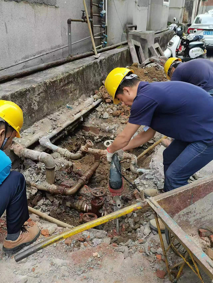 為解決群眾的飲用水問題,公司決定對新園路富華樓、富麗樓、富達(dá)樓、富苑樓、富榮樓、富強樓以及供電宿舍樓進(jìn)行老舊自來水管網(wǎng)改造。本改管工程投資約18萬元,主管道為DN100鋼塑管,各巷管為DN80-50鋼塑管,涉及用水戶100多戶。由于周邊大部分舊供水管埋在混凝土下面,并且地下密布電信、排污管等市政管道,極大地增加了地面開挖和后期路面修復(fù)的難度。為此,我公司施工人員多次踏勘現(xiàn)場,不斷優(yōu)化施工方案,調(diào)整了部分管線走向,盡量減少工程作業(yè)對周邊路面的破壞。11月下旬,施工人員開始進(jìn)場施工。他們在開鑿路面時發(fā)現(xiàn),部分老舊供水管道已生銹腐蝕,存在較大用水安全風(fēng)險,需將殘舊的鍍鋅管換成不易生銹變形的鋼塑復(fù)合管,才能進(jìn)一步改善水壓、水質(zhì)問題。與此同時,該片區(qū)剛好正在實施老舊小區(qū)改造工程。面對排污管道更換、墻面粉刷等多項市政工程同步推進(jìn)的影響,我公司保持與其他單位溝通協(xié)調(diào),采取交叉作業(yè)的方式提高施工效率,并建立改管工作微信群對施工安全、質(zhì)量和進(jìn)度等進(jìn)行精細(xì)化管理。另外,公司調(diào)配了充足的施工力量,開挖了3個點位,加快施工進(jìn)度。施工人員還采取錯峰作業(yè)、不定時對地面灑水等措施,以減少施工帶來的噪音、揚塵以及對居民的影響。