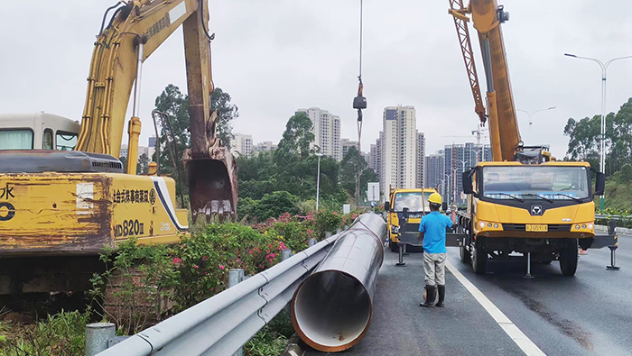 2021年1月通車的東成鎮(zhèn)發(fā)展大道,西起錦江大道東與國道G325線交會(huì)處,東至省道S297線,是恩平城區(qū)聯(lián)通江湛鐵路恩平站的一條高等級公路。隨著道路周邊恩平工業(yè)園職教園區(qū)項(xiàng)目一期(智造學(xué)院、職教中心)等項(xiàng)目的陸續(xù)開工建設(shè),生產(chǎn)生活用水需求日益增長。因發(fā)展大道位于東成鎮(zhèn)石崗、金坑村委會(huì)轄區(qū),位置較為偏僻,沿線尚未鋪設(shè)供水主干管道。為完善沿線一帶的市政供水管網(wǎng),保障職教園區(qū)等項(xiàng)目及周邊的用水需求,我公司積極推進(jìn)發(fā)展大道DN800供水管道安裝工程。